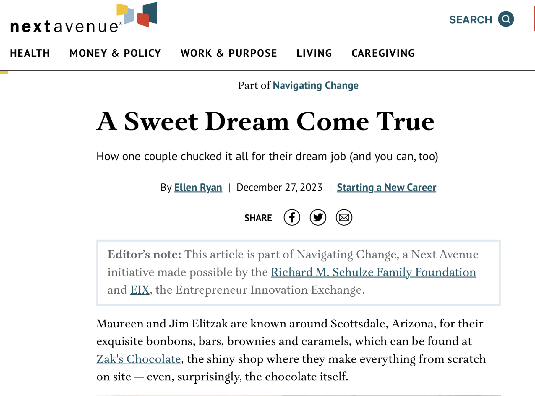 The story about us in PBS Next Avenue has a really different focus than any article we’ve been fortunate enough to have been featured in before. It’s about how we got into starting up a little chocolate shop and related entrepreneurial stuff. We hope you’ll enjoy it as much as we enjoyed the interview questions that made us reflect on how and why we get to be able to share our chocolate with you.
